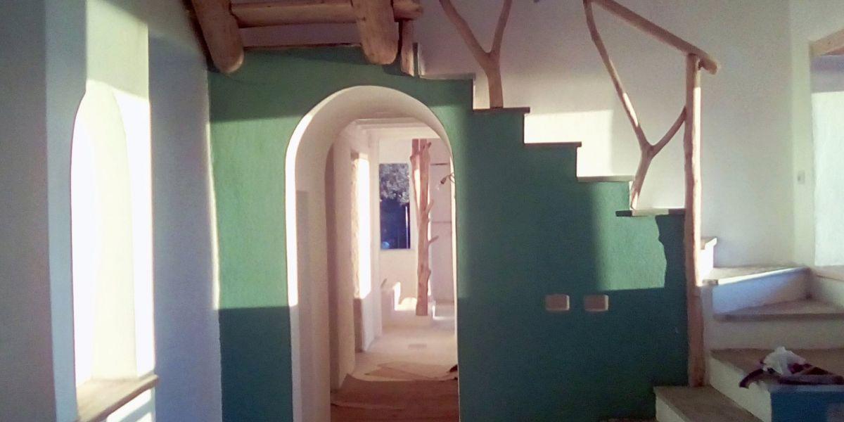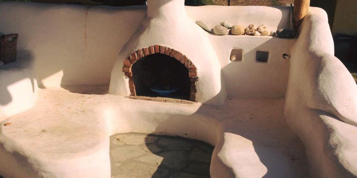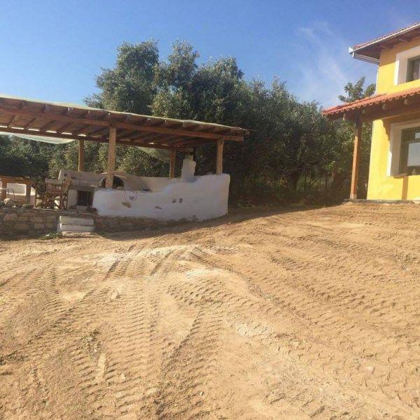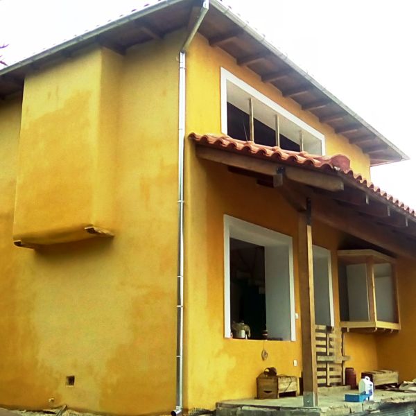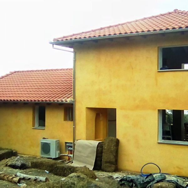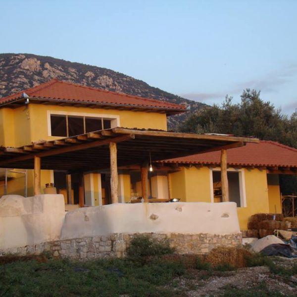 The house of Michaela and Panos started as an idea after a natural building workshop. Leaving home and business in Athens the young couple looked for a more qualitative life in the suburbs of Volos. Their new house is representative of this seeking.                          The house was made with the straw&clay technique and combines exceptional thermal insulation, ease of manufacture and is free from the construction difficulties that strawbale houses have. It has a wooden frame and the walls are made of a mix of straw and clay. For the construction of the house a mixed group of specialised builders of cob.gr,volunteers and the owners worked together. It was a truly unique process that effectively put into practice the “houses by people for people” approach.